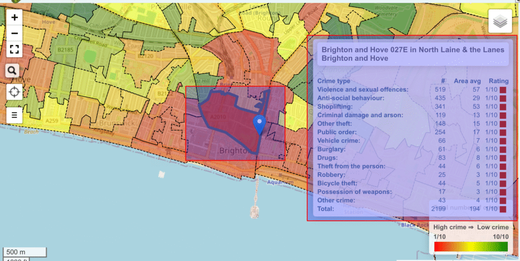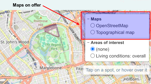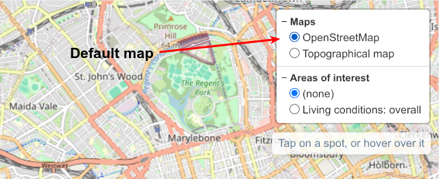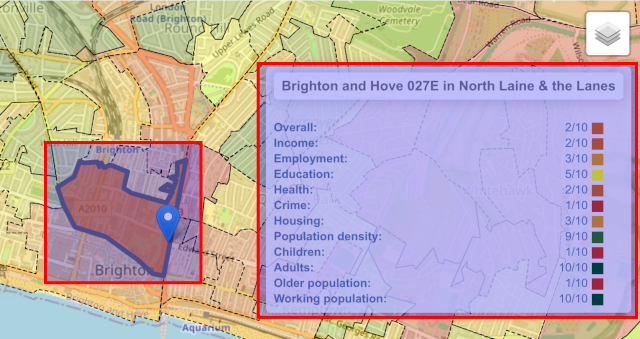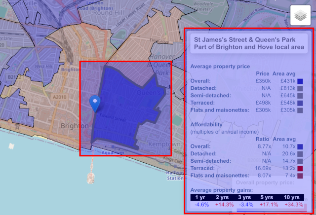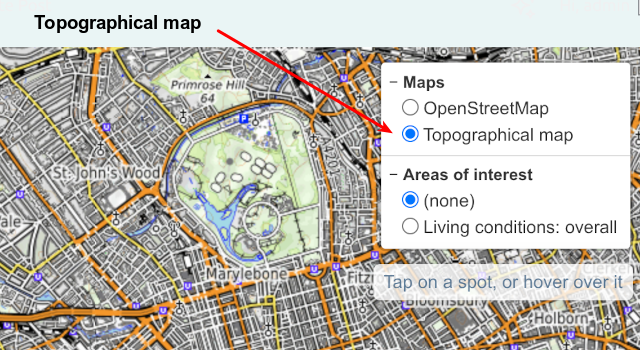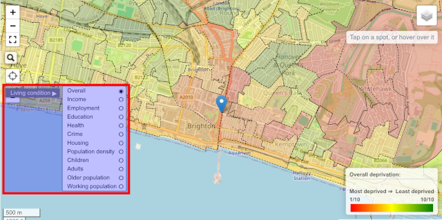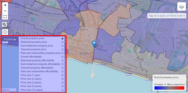 - Areas of interest: These are geographical areas that each share one fact, like a property price, the deprivation statistics, the crime statistics, the flood risk, the radon gas level, or the member of parliament. Each one of these are coloured and overlaid on top of the map. Only one of these can be active at a time – activating several of these at the same time makes for a very messy set of colours!