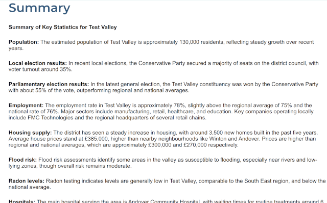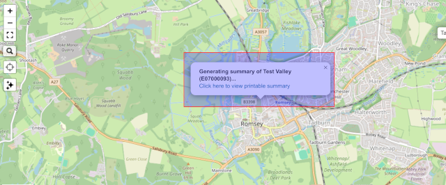For our premium members, we offer extra functionality where we can generate a written summary of any area. Underneath the crosshairs button, there is another button with a stars logo. Pressing this button will generate a popup window on the map, with a link to generate a summary. Pressing this link will take you to a separate page with a detailed summary of the area.