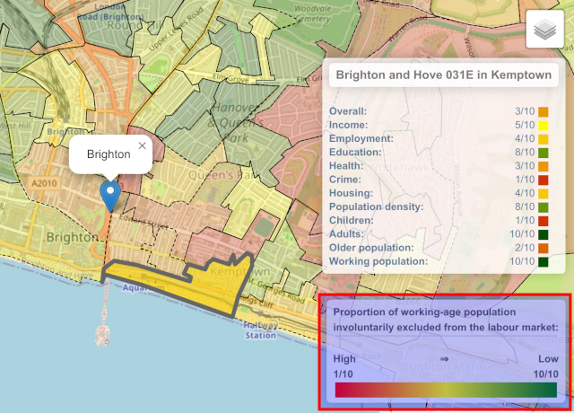 - Points of interest: These are a set of points overlaid on the map. Each point represents one item tied to a location. Each point can represent for instance a school, a doctor’s surgery, a hospital, a prison, a power station, a wind farm, and a number of others. Several of these overlays can be active at the same time.