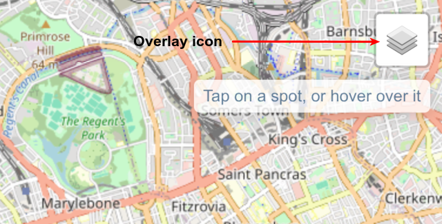 The multiple squares icon at the top right allows you to choose both the base map, and any overlays.