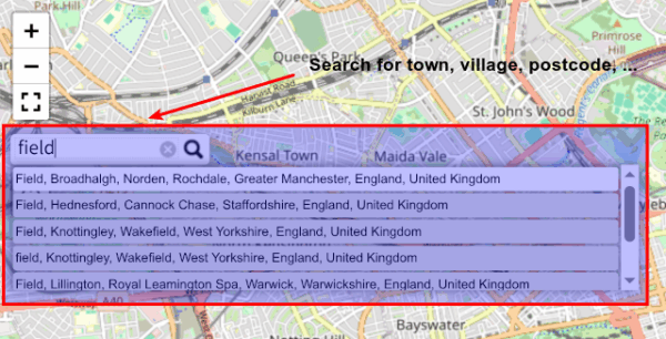 The magnifying glass at the top left of the map allows you to search for any place, village, or postcode in England (the rest of the UK coming shortly). The best matches for the name you type are shown as you search. Clicking on any of the choices will move the map to the selected location.